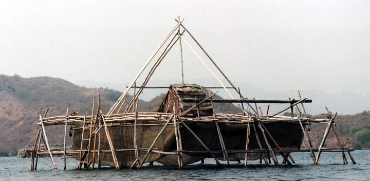 Ein riesiges Fischernetz, das das fest auf dem Meer verankert ist.
