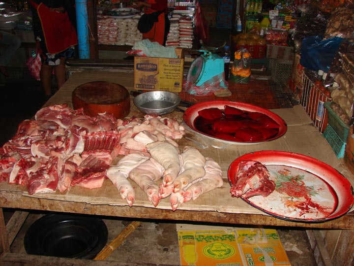 Luang Prabang die alte Königsstadt und UNESCO Weltkulturerbe. Auf dem Markt, in der Schüssel hinten hat es frisches Blut.