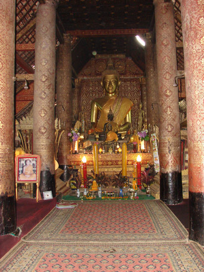 Wat Xieng Thong Buddha Tempel. An Säulen und Wänden aussen und innen wurden Goldverzierungen in Schablonentechnik auf die schwarze Grundfarbe aufgetragen.