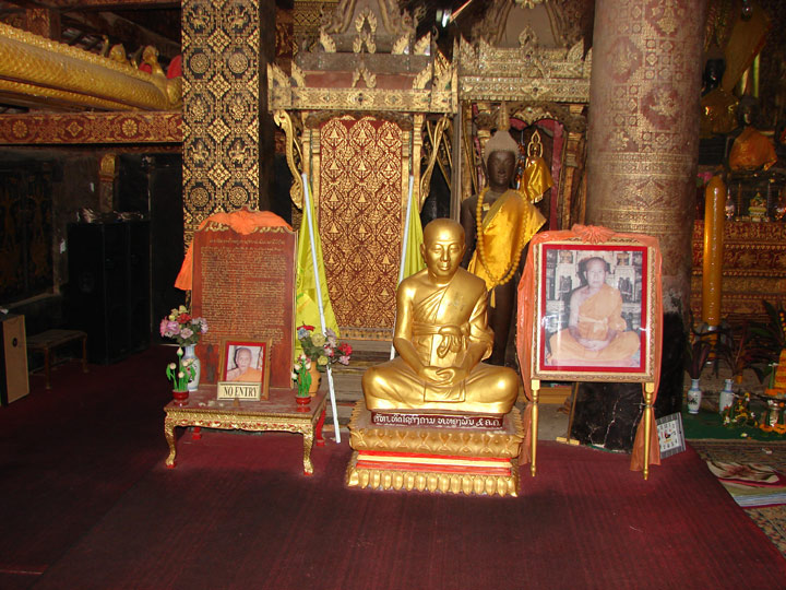 Wat Xieng Thong An Säulen und Wänden aussen und innen wurden Goldverzierungen in Schablonentechnik auf die schwarze Grundfarbe aufgetragen.