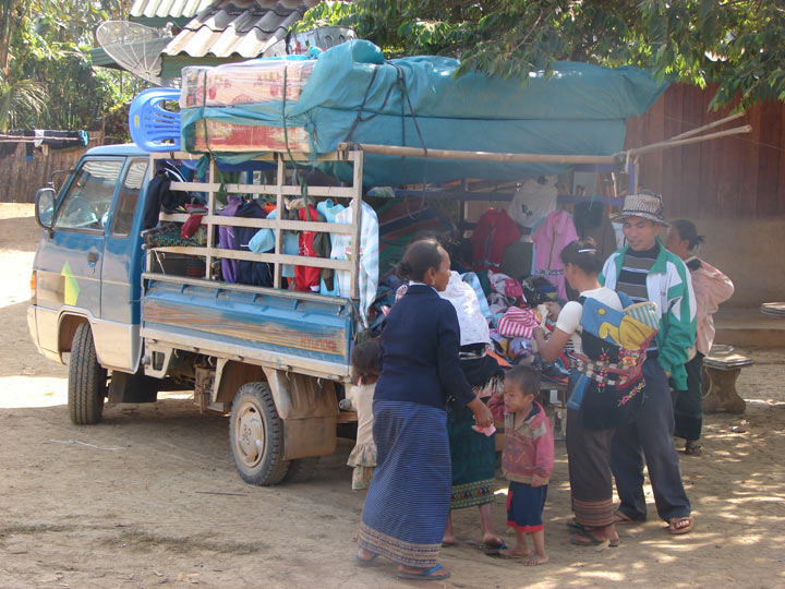 Auf der Fahrt nach Xieng Khuang (Ebene der Tonkrüge)Mobiler Kleiderverkäufer aus Vietnam.