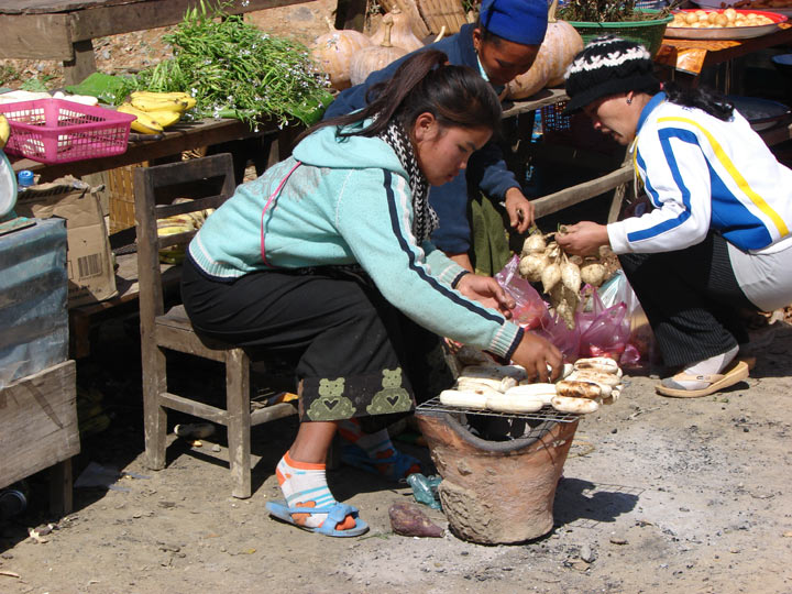 Auf der Fahrt nach Xieng Khuang (Ebene der Tonkrüge)Bananen werden auf einem kleinem Grill gebacken.
