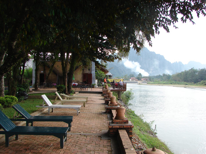 Unser Resort in Vang Vieng; das Ban Sabai Bungalows, das Frühstück gab hier auf der Terrasse.