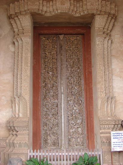 Wat Ho Phra Keo, wurde im Jahre 1565 als königliche Kapelle und Zufluchtsort für die berühmte Statue des Buddha Smaragdového erbaut. Eine kunstvoll geschnitzte Tür.