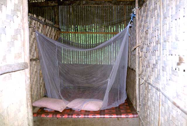 Schlafkoje mit Bett und Moskitonetz.