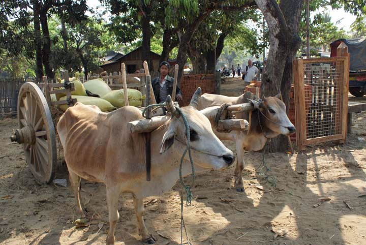 Fahrt zum Elefantencamp, ein Ochsenkarren, der Reis anliefert.