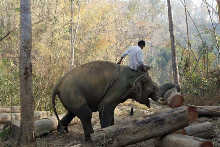 Elefantencamp, mit den Stosszähnen wird ein Stamm gehoben.