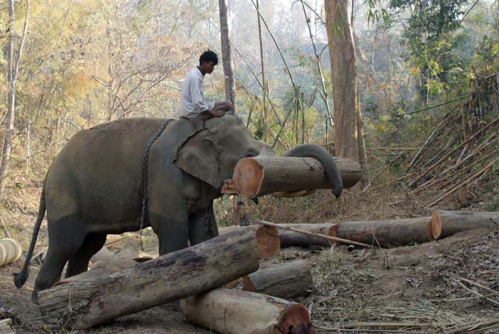 Elefantencamp, mit den Stosszähnen wird ein Stamm gehoben.