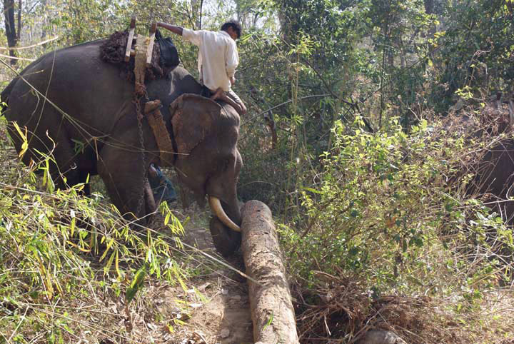 Elefantencamp, die Elefanten bugsieren die Teakholzstämme aus dem Urwald.