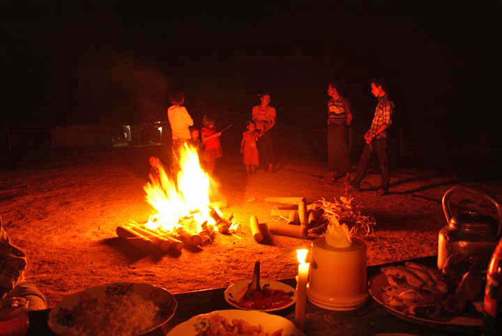 Übernachtung im Kayin Dorf, das Nachtessen am Lagerfeuer beim Schulhaus. Den ganzen Abend kamen immer wieder Einheimische vorbei um zu sehen was da für Leute im Schulhaus übernachten.