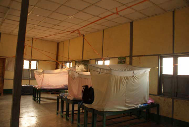 Übernachtung im Kayin Dorf, unsere Betten auf den Schultischen.