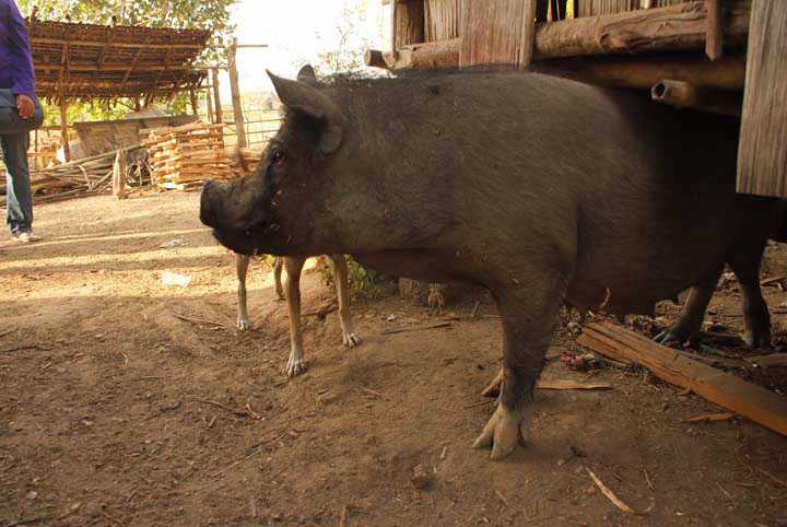 Das Kayin Dorf, das Hausschwein darf nicht fehlen.