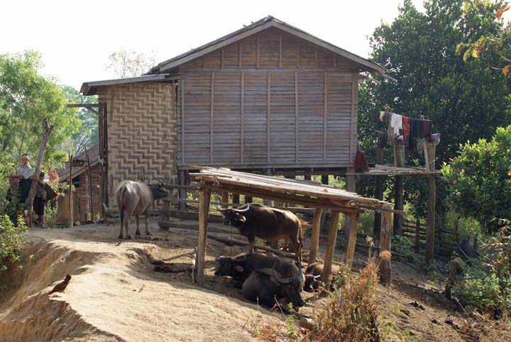 Das Kayin Dorf, auch die Rinder leben mitten im Dorf.