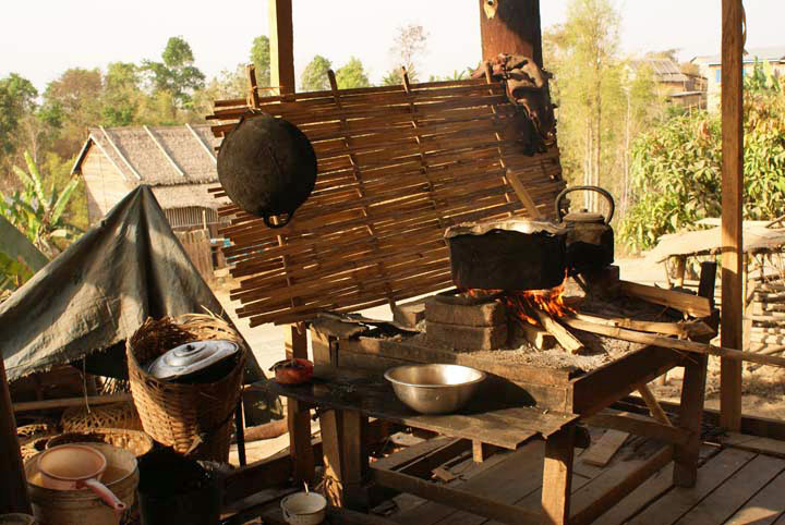 Das Kayin Dorf, offene Feuerstelle auf einer Art Balkon.