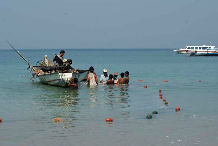 Ngapali Beach, Fischerboot direkt vor unserem Hotel beim auslegen des Fischernetzes.