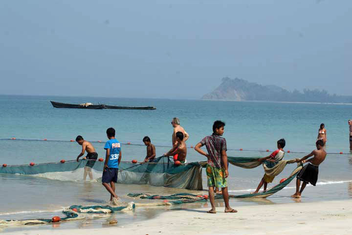 Ngapali Beach, Fischerboot direkt vor unserem Hotel beim auslegen des Fischernetzes.