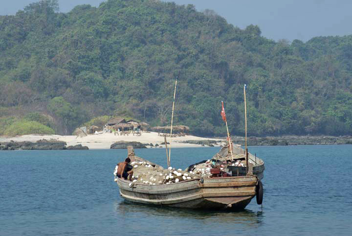 Ngapali Beach, Vollbeladenes Fischerboot mit Netzen.