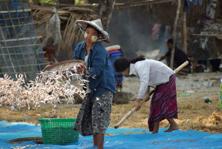 Ngapali Beach, die Fische werden auf blauen Netzen ausgebreitet und anschliessend an der Sonne getrocknet.