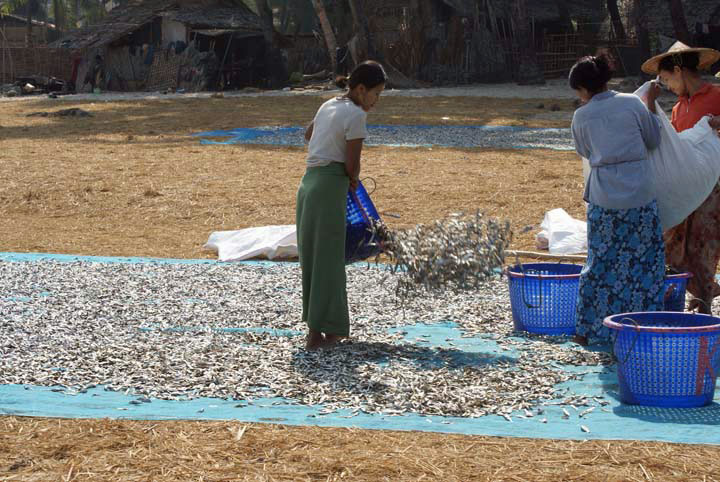 Ngapali Beach, die Fische werden auf blauen Netzen ausgebreitet und anschliessend an der Sonne getrocknet.