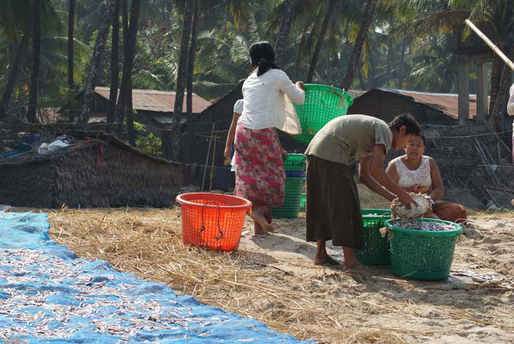 Ngapali Beach, die Fische werden auf blauen Netzen ausgebreitet und anschliessend an der Sonne getrocknet.