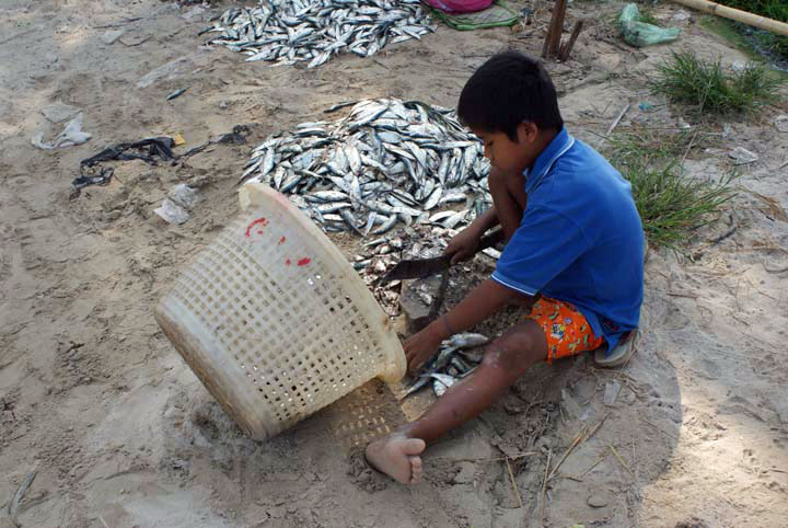 Ngapali Beach, ein Junge beim ausnehmen der Fische.