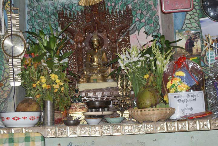 Shwe Myin Tin Pagoda Pagode mit Kloster, Buddhafigur im Zimmer vom Abt.