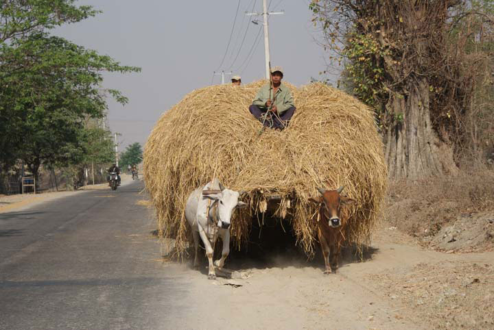 Rückfahrt nach Pyay, Ochsenkarren mit Stroh beladen.