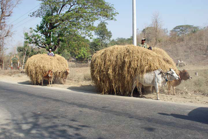 Rückfahrt nach Pyay, Ochsenkarren mit Stroh beladen.