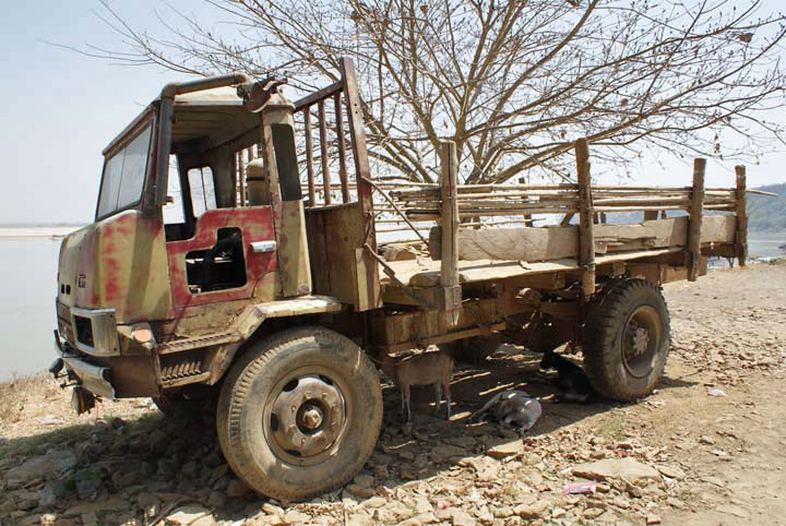 Rückfahrt nach Pyay, LKW mit einer Pritsche aus Holz.