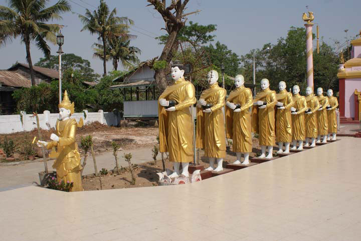 Shwe Myettman Pagode. Mönchsfiguren vor der Pagode.
