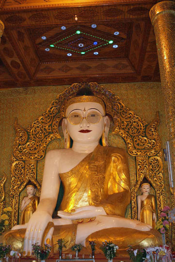 Shwe Myettman Pagode. Die einzige Buddhafigur weltweit mit einer Brille.