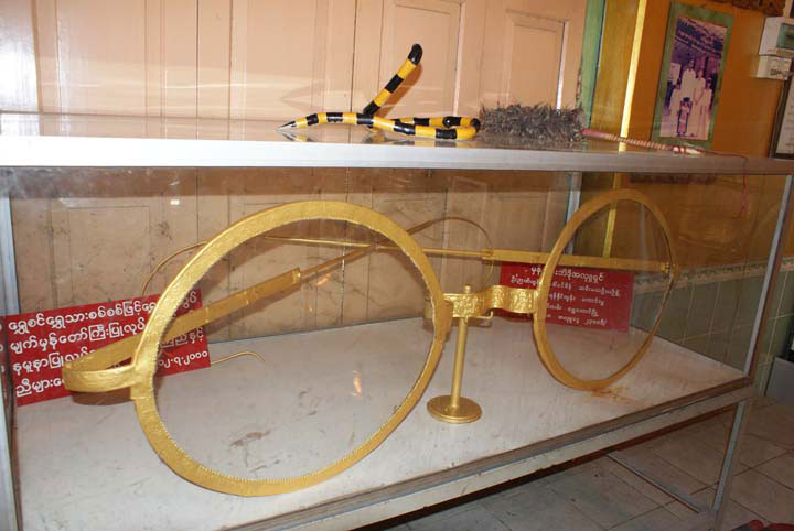 Shwe Myettman Pagode. Die Originalbrille aus Gold ist hinter Glas.