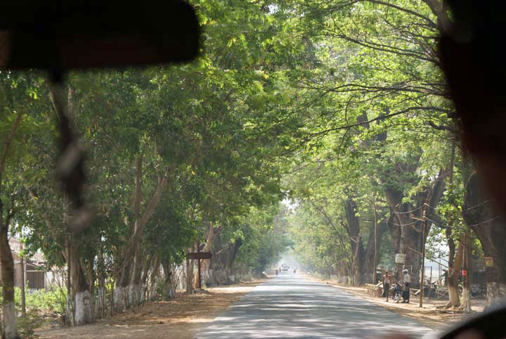 Fahrt durch eine Baumallee Richtung Yangon.