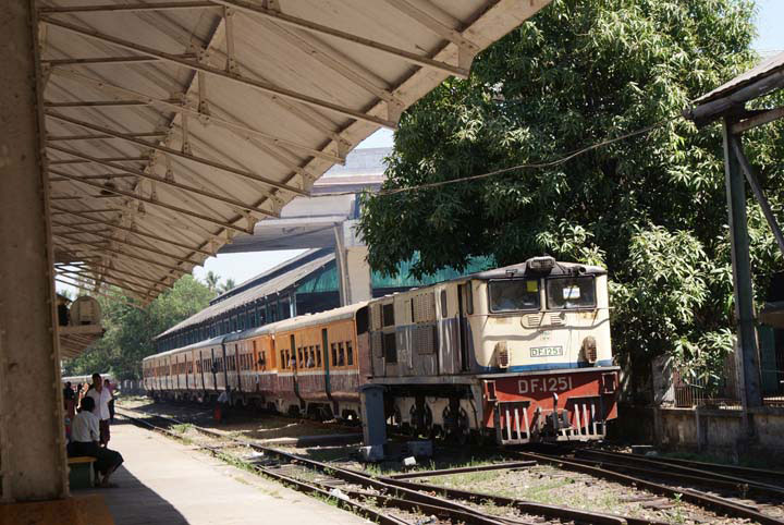 Auf dem Bahnhof in Yangon, mit diesem Zug werden wir gleich 3 Stunden unterwegs sein.