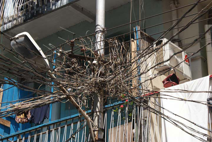 Spaziergang durch die Gassen, elektrische Anschlüsse auf burmesisch.