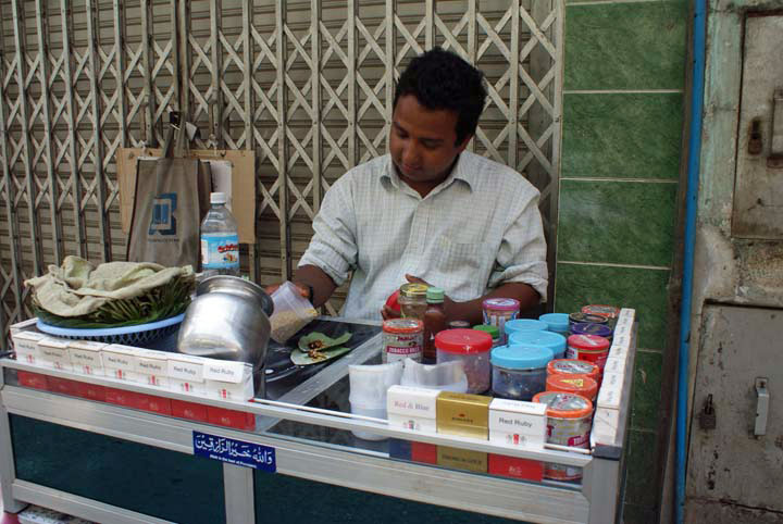 Spaziergang durch die Gassen, die "Nationaldroge" Bettelnüsse werden in ein Blatt mit verschiedenen "Gewürzen" gelegt.