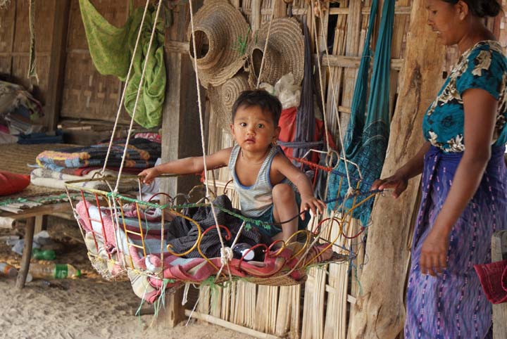 Besuch eines Dorfes. Der Kleine fühlt sich wohl in seinem Schaukelbett.