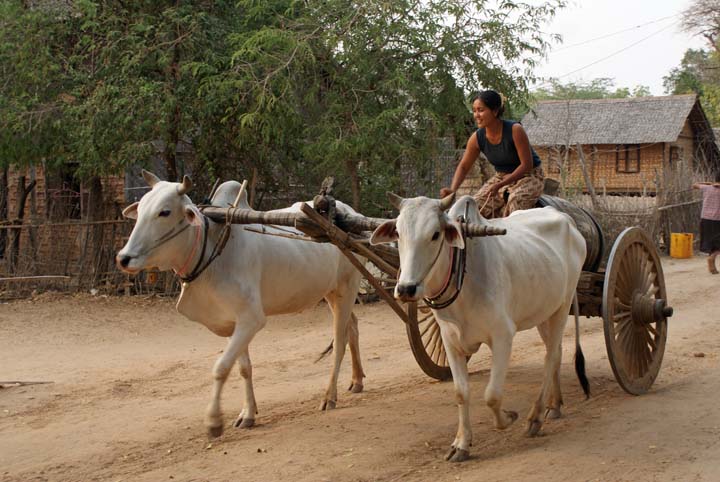 Besuch eines Dorfes. Ein Ochsenkarren, die man noch in ganz Myanmar sehr häufig sieht.