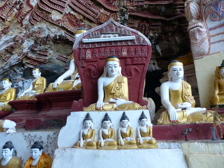 Kawgon-Höhle. Der rote Ton und die goldenen Buddhafiguren geben ein schönes Farbenspiel.
