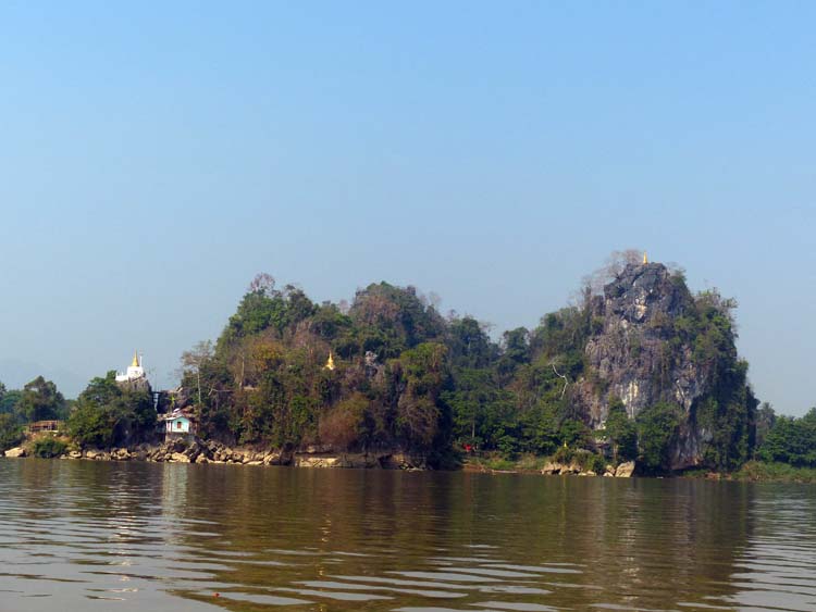 Bootsfahrt von Hpa-an nach Mawlamyaing. Überall sieht man auf den Felsen Stupas.