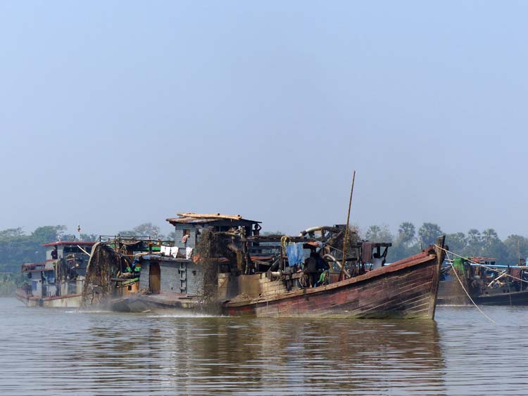 Bootsfahrt von Hpa-an nach Mawlamyaing. Diese Boote baggern Kies aus dem Fluss.
