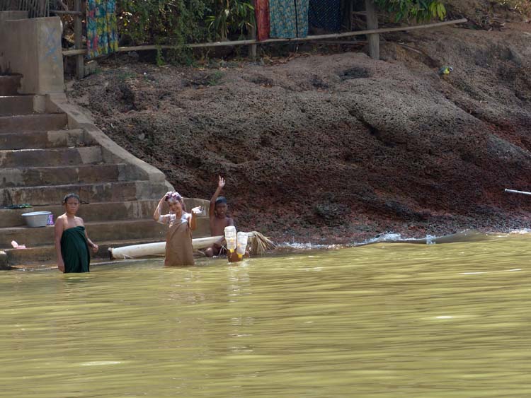 Bootsfahrt von Hpa-an nach Mawlamyaing. Gross und Klein bei der Morgenwäsche.