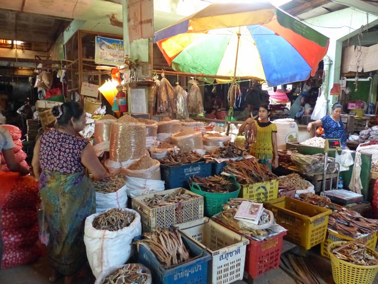 Grossmarkt in Mawlamyaing. Getrockneter Fisch und Shrimps.