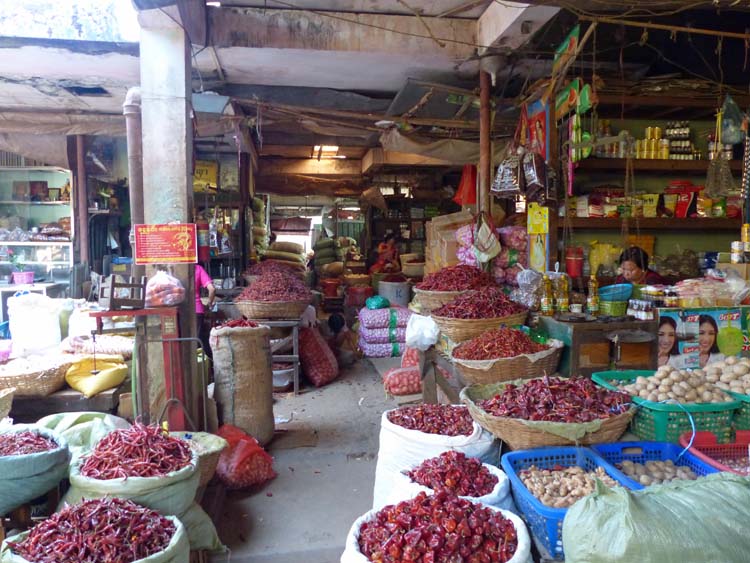 Grossmarkt in Mawlamyaing. Massenhaft Chilis.