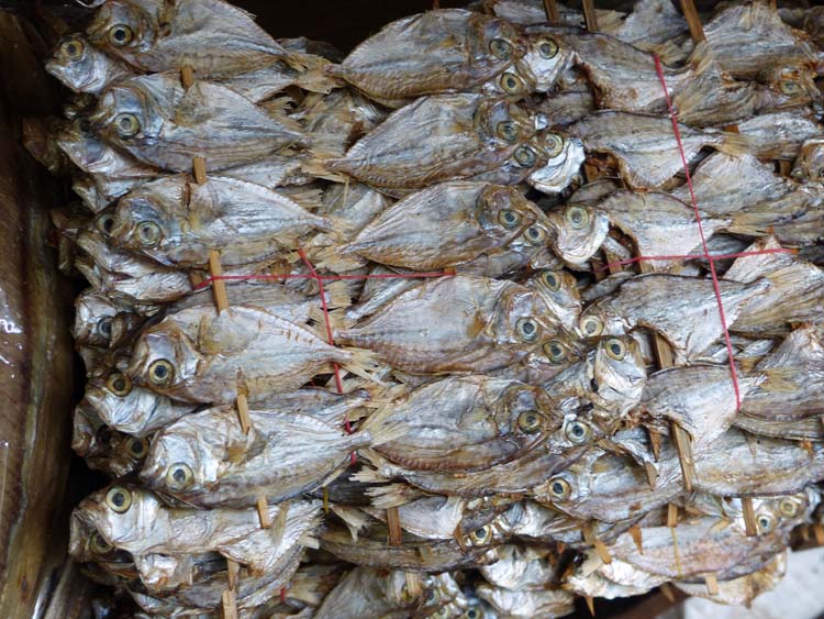 Markt von Dawei, leckere getrocknete Fische am Spiess.