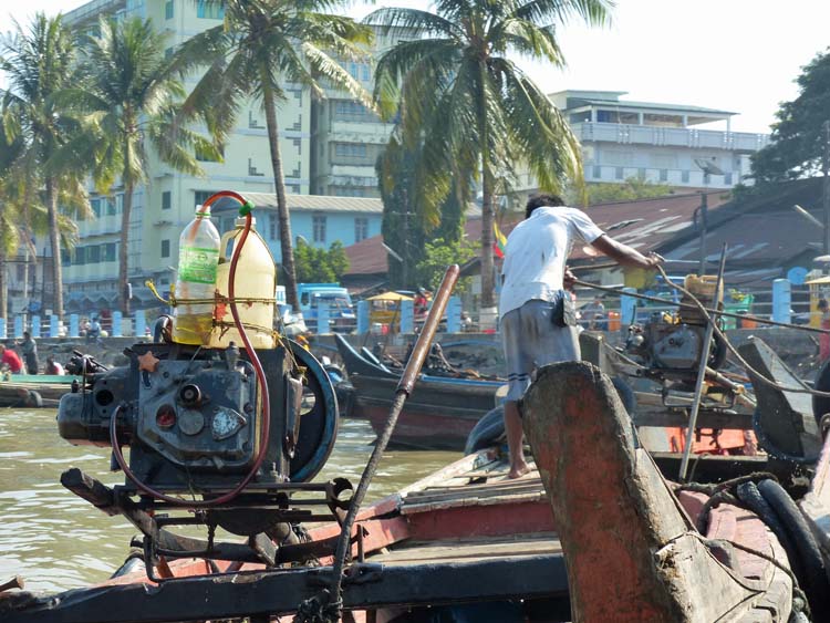 Bootsfahrt auf die Insel Pa Htaw Pa Htet, Pet-Flasche dient als Benzintank