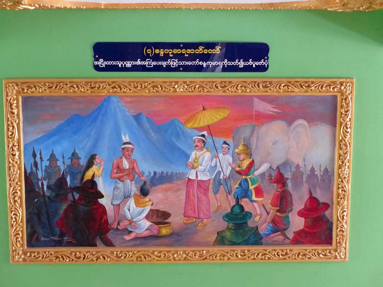 liegender Buddha, zudem wird die Geschichte vom Buddha bildlich dargestellt