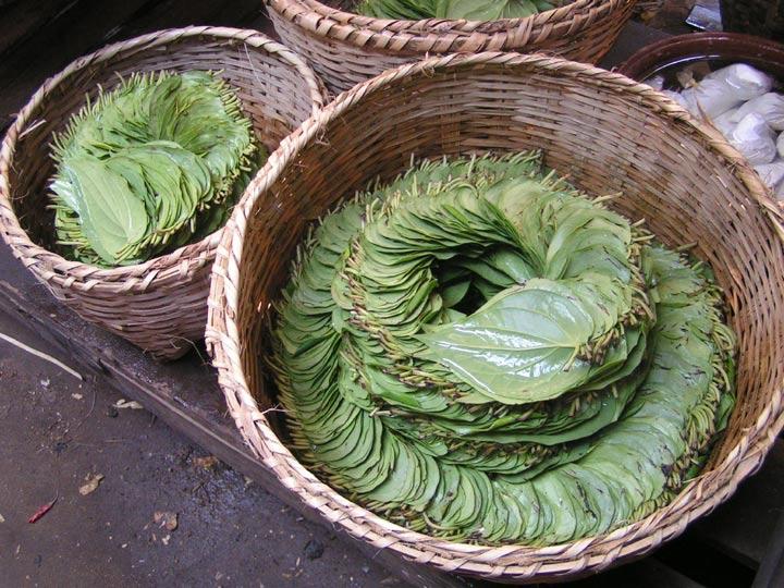Nyaung Oo Markt Blätter die benutzt werden um die Bettelnuss einzuwickeln.