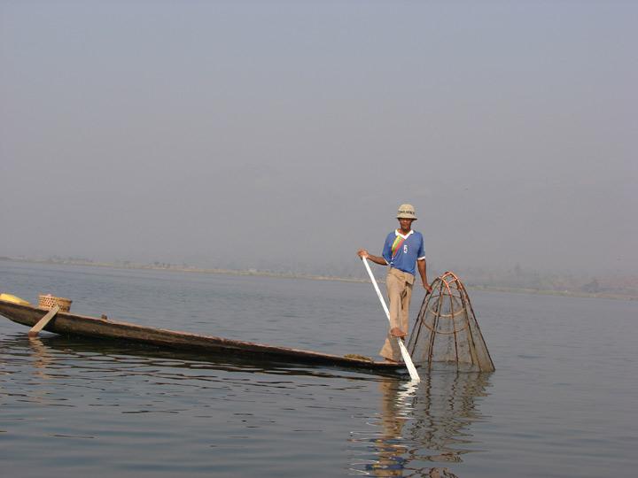 Inle See Die bekannten Einbeinruder, die es nur hier am Inle See gibt, so bleibt immer noch mindestens eine Hand übrig um zu Fischen.