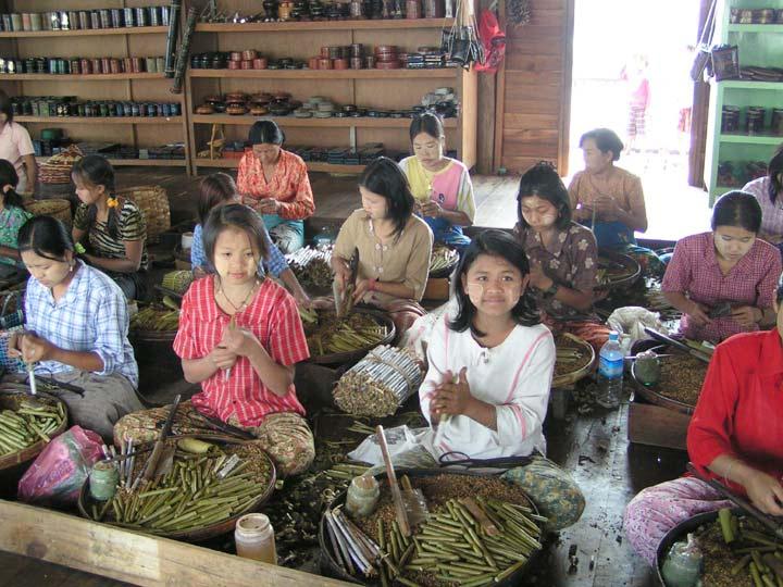 Handwerksbetriebe auf dem Inle See Zigarrenherstellung, für 1'000 Zigarren Tagesleistung erhalten die Frauen 1 Franken!